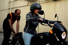 在沙特東部省胡拜爾saso辦理的哈雷戴維森經(jīng)銷(xiāo)商店,saso驗(yàn)貨一名女子在教練的協(xié)助下騎上這輛殿堂級(jí)的電單車(chē)。