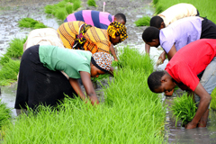 陳華林和專家們來(lái)到這個(gè)村,坦桑尼亞coc清關(guān)教當(dāng)?shù)厝朔N地。陳華林和專家們拿長(zhǎng)線當(dāng)標(biāo)尺,每約16.5厘米畫(huà)上一個(gè)刻度,將長(zhǎng)線在田里細(xì)細(xì)拉直,給坦桑尼亞農(nóng)民示范按照間距插秧。又動(dòng)員他們挖水塘,積水來(lái)對(duì)抗干旱。