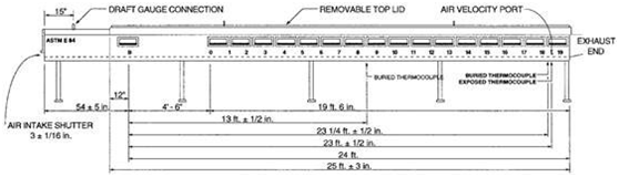 ASTM E84的測試設(shè)備是一個(gè)隧道爐,長約7.6m,詳見下圖。