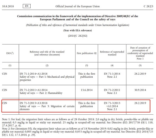 目前玩具指令特定元素遷移的協(xié)調(diào)標(biāo)準(zhǔn)為EN 71-3:2013+A3:2018。