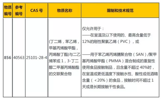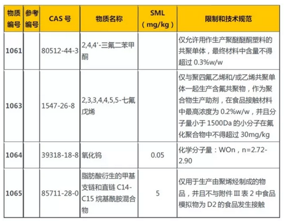 2018年1月19日,歐盟官方公報(bào)(OJ)發(fā)布與食品接觸的塑料制品法規(guī)(EU)10/2011的修訂法規(guī)(EU) 2018/79。歐盟食品級(jí)塑料法規(guī)從(EU)10/ 2011發(fā)布以來,已歷經(jīng)9次修訂。 (EU)2018/79作為第9次修訂, 更新了(EU)2011/10附錄I的授權(quán)清單, 新增了新增2,4,4'-三氟二苯甲酮、2,3,3,4,4,5,5-七氟戊烯、氧化鎢、脂肪酸衍生的甲基支鏈和直鏈C14-C15烷基酰胺混合物等4項(xiàng)授權(quán)物質(zhì),并擴(kuò)大了(丁二烯,苯乙烯,甲基丙烯酸甲酯,丙烯酸丁酯)與二乙烯苯或1,3-丁二醇二甲基丙烯酸酯的交聯(lián)聚合物的使用范圍。