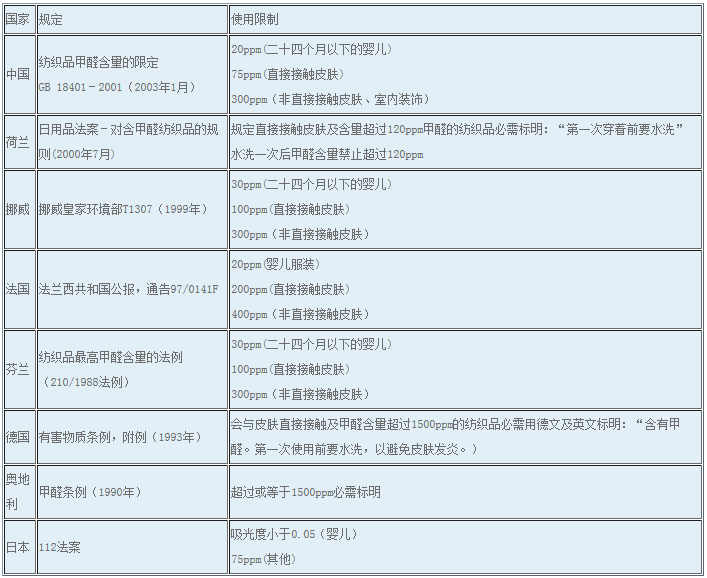 含甲醛的紡織品在穿著和使用過程中,部分未交聯(lián)的或水解產(chǎn)生的游離甲醛會釋放出來,對人體健康造成損害,因此,世界主要國家紛紛出臺相關(guān)的法規(guī)或強制標準,對產(chǎn)品的游離甲醛含量作了嚴格的限定。
