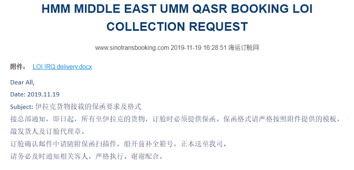 11月19日起,所有運(yùn)至伊拉克的貨物,訂艙時(shí)必須提供保函。保函格式按照船公司提供的模板,敲發(fā)貨人及訂艙代理章。