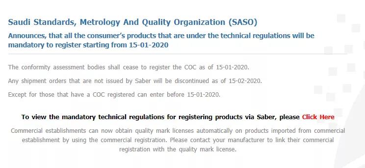 2020年1月15日起,出口沙特所有管制產品強制通過SABER注冊