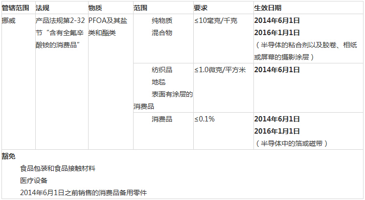 2013年6月28日,挪威環(huán)保局宣布了一項消費品中PFOA及其鹽類和酯類的國家禁令。限制令適用于固體和液體產(chǎn)品,也包括紡織品。