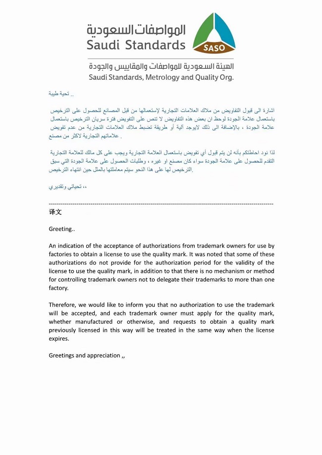 沙特標(biāo)準(zhǔn)局SASO關(guān)于QM的通知