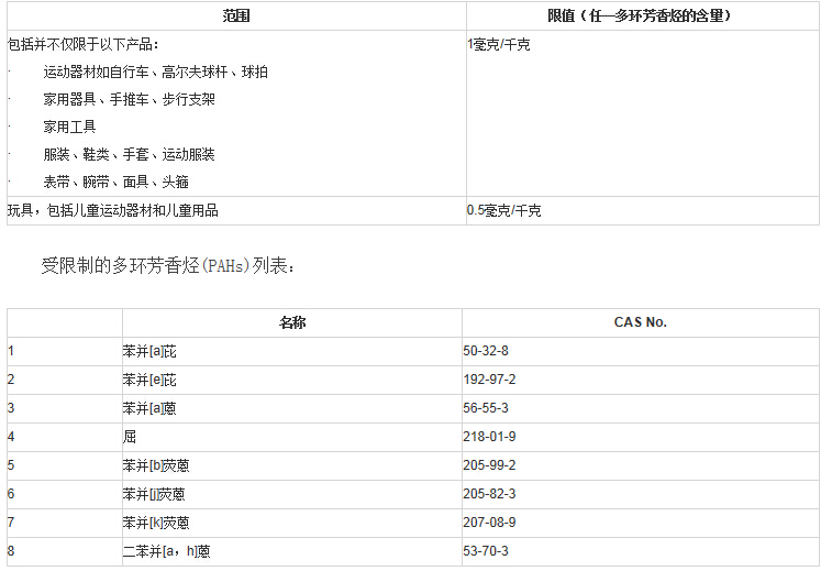 REACH法規(guī)附錄17第50條主要是限制輪胎的填充油中的多環(huán)芳香烴(PAHs),此次提案將多環(huán)芳香烴(PAHs)的限制擴展到了能長期或短期重復接觸皮膚或口腔的產(chǎn)品。具體信息如下: