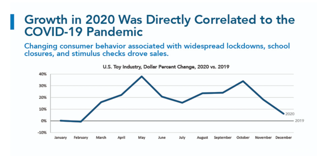 由于65%的美國(guó)中小學(xué)生仍然是遠(yuǎn)程學(xué)習(xí),娛樂(lè)場(chǎng)所依舊關(guān)閉,疫情下對(duì)玩具的需求不斷增加,2021年有可能成為美國(guó)玩具銷售又一個(gè)強(qiáng)勁年。