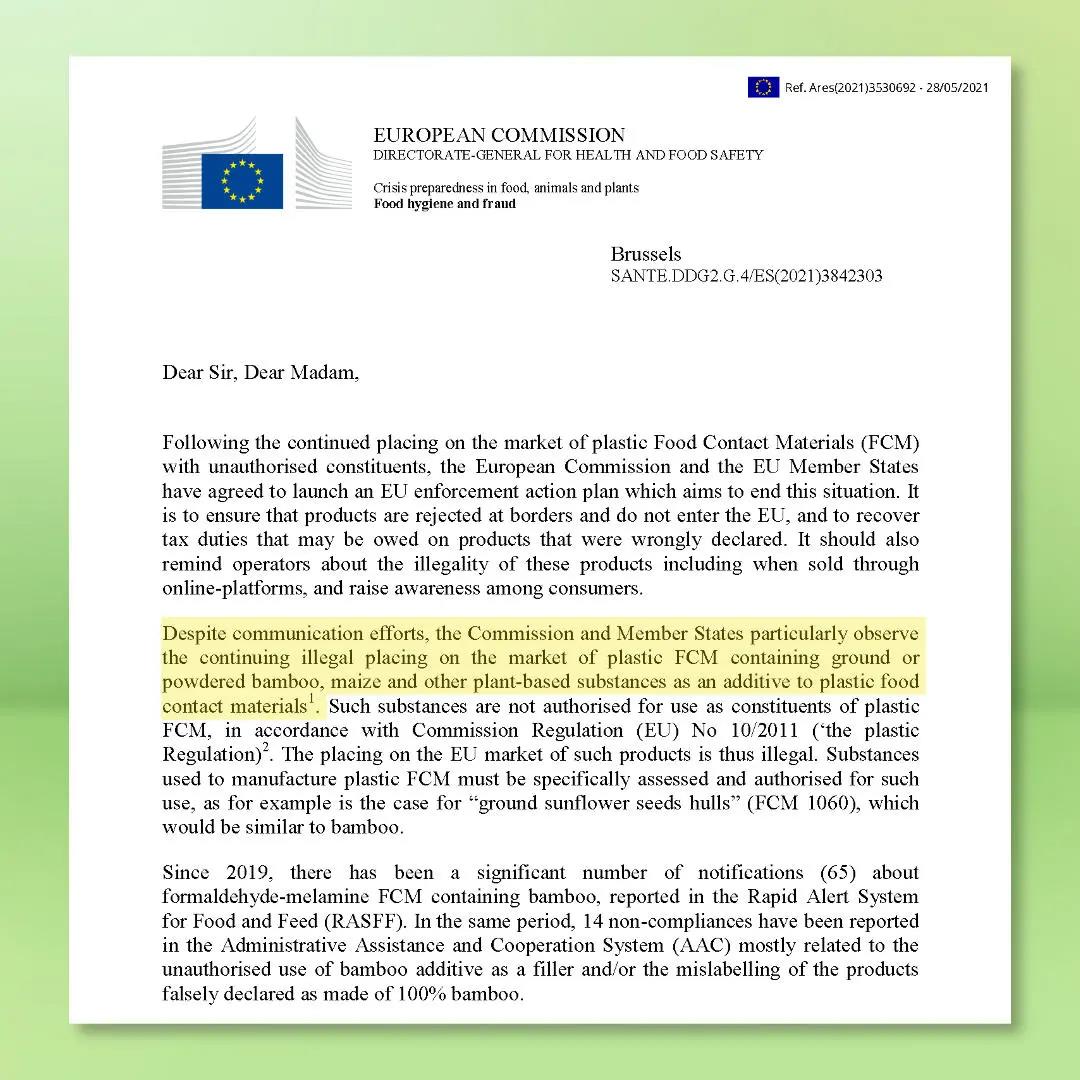 然而2021年5月28日,歐盟委員會(huì)通過(guò)郵件通知利益相關(guān)者,表示會(huì)協(xié)助歐盟成員國(guó)啟動(dòng)“停止含有未經(jīng)授權(quán)的含竹纖維類塑料材料及制品在市場(chǎng)上銷售”的強(qiáng)制計(jì)劃。一紙禁令導(dǎo)致相關(guān)產(chǎn)業(yè)急剎車。