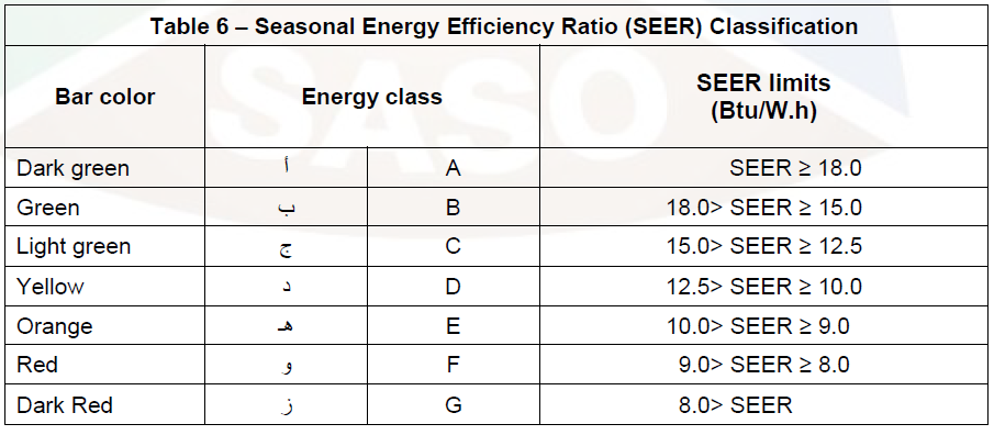 SEER的計算方法依據(jù) SASO ISO 16358-1:2013, Clause 6 和 ISO 16358-1:2013/AMD 1:2019,能效等級判定如下: