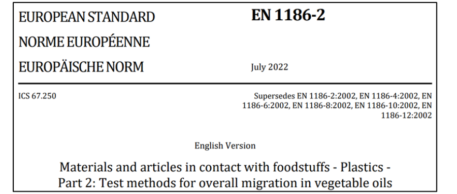 新版EN 1186-2:2022:將測(cè)試“橄欖油中總遷移量”的原六項(xiàng)2002版標(biāo)準(zhǔn)EN 1186-2、1186-4、1186-6、1186-8、1186-10和1186-12整合為一個(gè)標(biāo)準(zhǔn)。