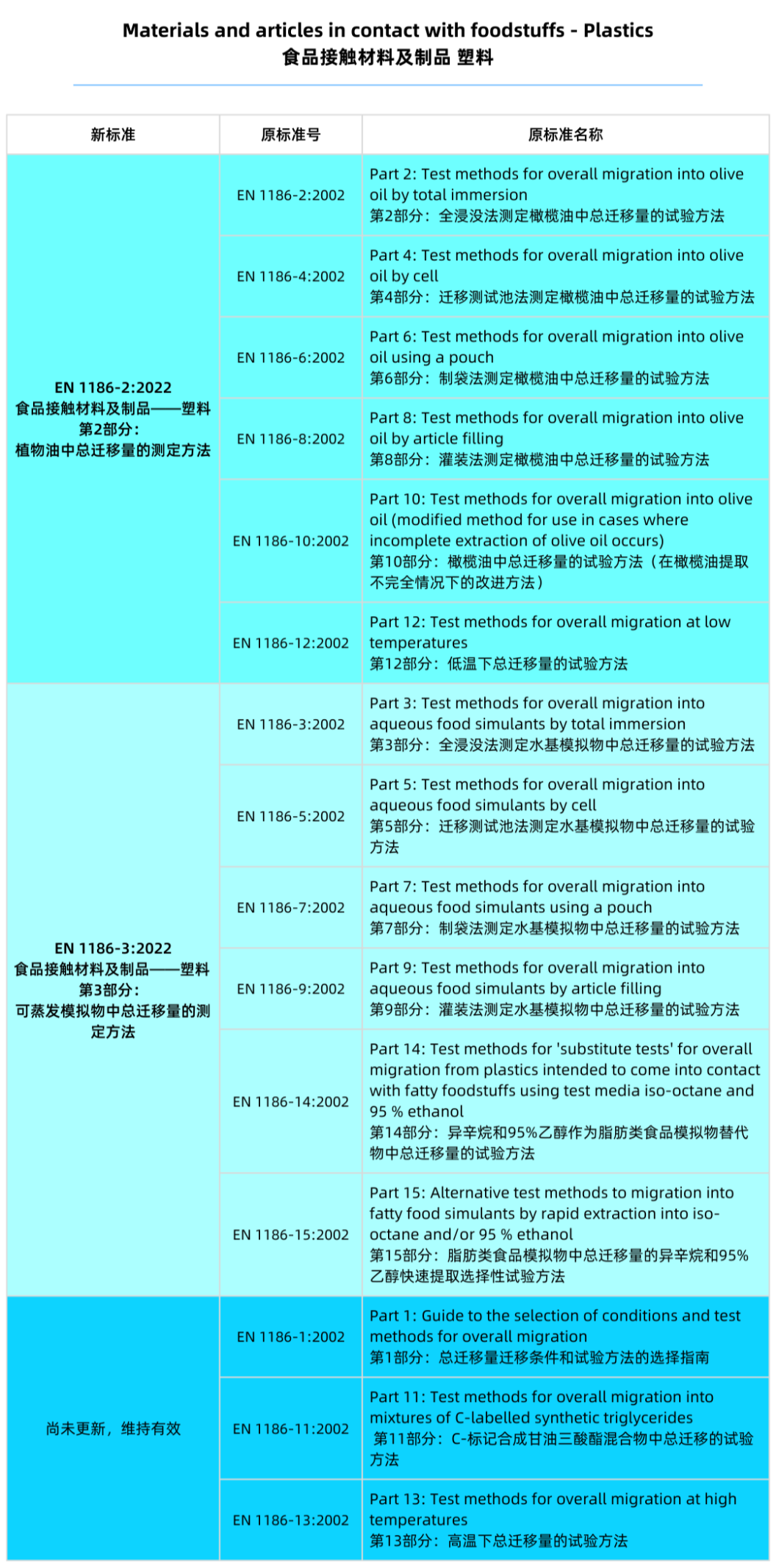 新版EN 1186-3:2022:將測(cè)試“水基模擬物及替代溶劑中總遷移量”的原六項(xiàng)2002版標(biāo)準(zhǔn)EN 1186-3、1186-5、1186-7、1186-9、1186-14和1186-15整合為一個(gè)標(biāo)準(zhǔn)。