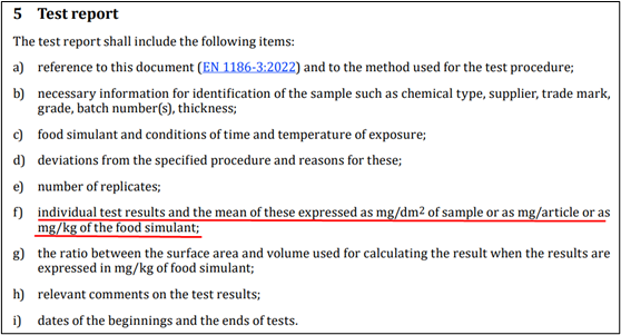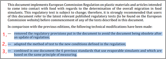 根據(jù)(EU)No. 10/2011及其修正案article 12 第2條及article 17第4條的規(guī)定的新條件,為滿足關(guān)于所有遷移試驗(yàn)類(lèi)型測(cè)試結(jié)果表達(dá)方式的要求,兩項(xiàng)標(biāo)準(zhǔn)都調(diào)整了測(cè)試方法,并增加了相應(yīng)的結(jié)果表述。