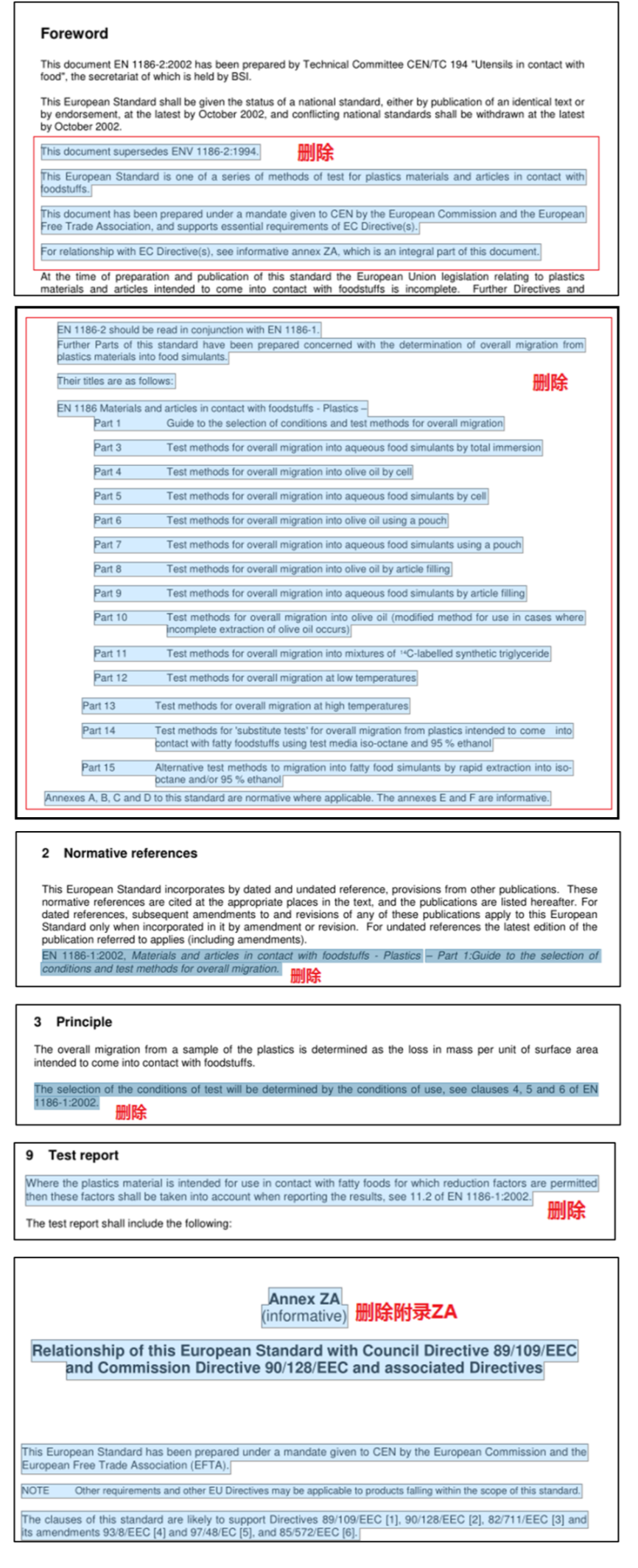 刪除了2002版標(biāo)準(zhǔn)中前言、第二章、第三章及文中測(cè)試步驟、測(cè)試報(bào)告中對(duì)EN 1186-1:2002的引用,同時(shí)也刪除了原標(biāo)準(zhǔn)附錄ZA及相關(guān)引用,以避免相關(guān)法規(guī)更新后導(dǎo)致標(biāo)準(zhǔn)的失效。