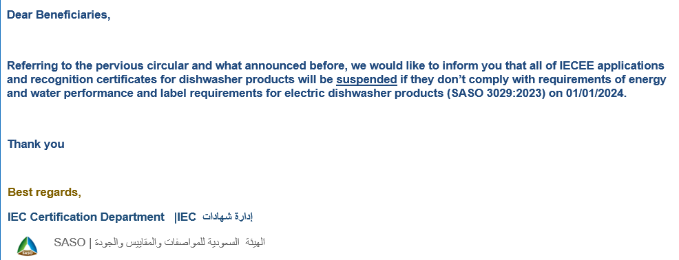 2024年1月1日起,不符合SASO 3029:2023能源、水性能和標(biāo)簽要求的相關(guān)產(chǎn)品將不接受其申請(qǐng)IECEE認(rèn)證和認(rèn)可證書(shū)。