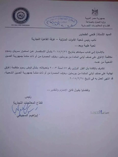 由于埃及進(jìn)口商進(jìn)口的陶瓷餐具在市場售賣價(jià)格高于埃及本國工廠生產(chǎn)的陶瓷餐具,這導(dǎo)致大部分進(jìn)口商產(chǎn)品滯銷,最后不得不向政府發(fā)文訴苦,隨后政府部門相繼作出以下回復(fù)文章: