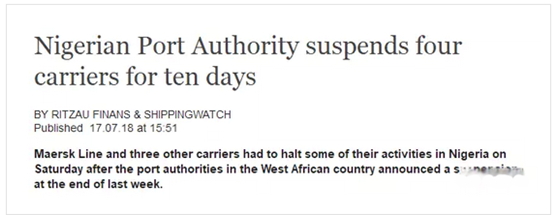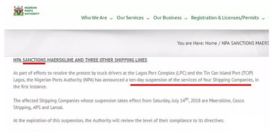 尼日利亞港務(wù)局(NPA)在一份新聞稿中表示,從當(dāng)?shù)貢r(shí)間7月14日開始,尼日利亞所有港口將暫停對馬士基,中遠(yuǎn)海運(yùn),APS和Lansal四家航運(yùn)公司提供港口服務(wù),為期10天!